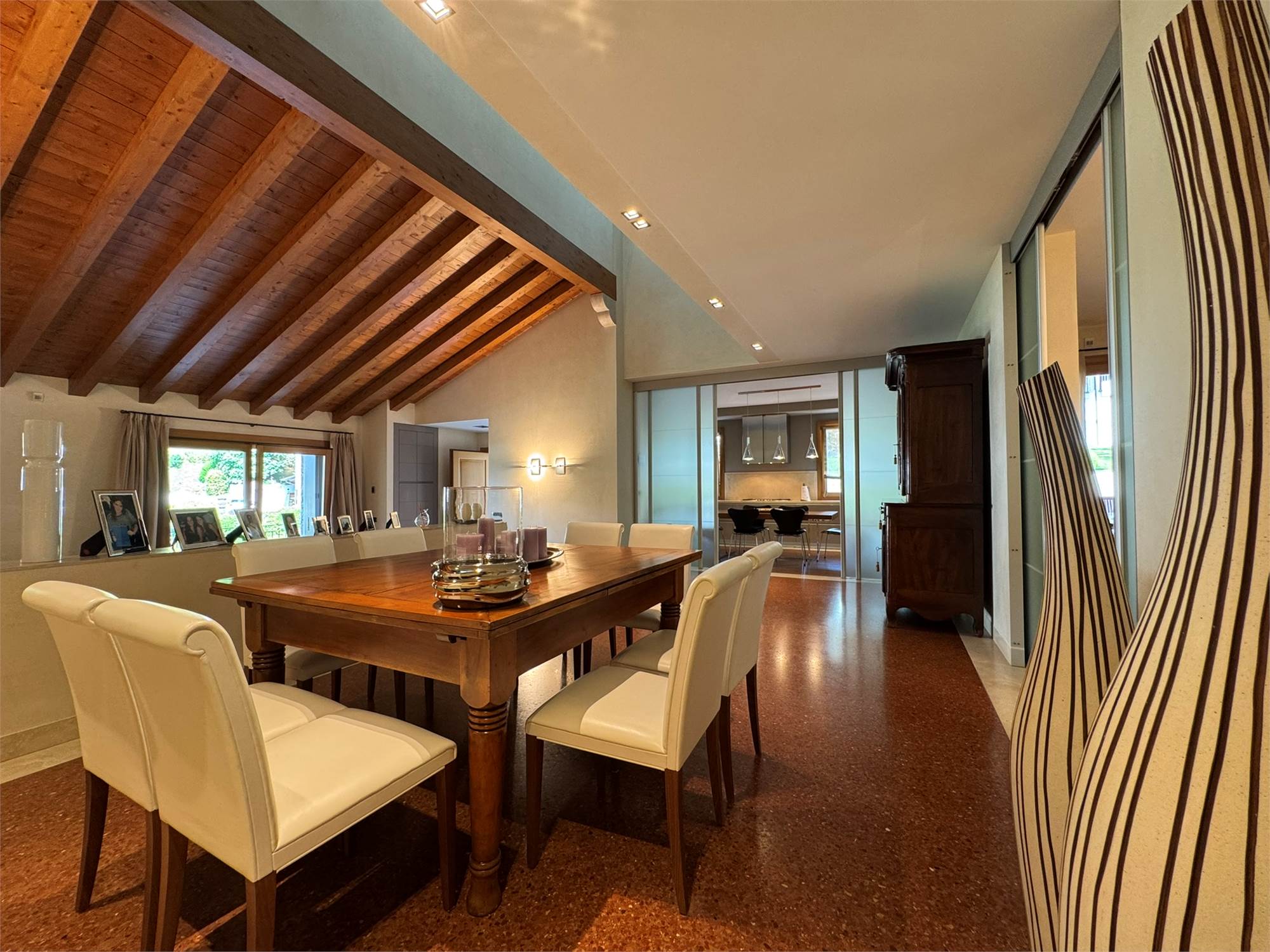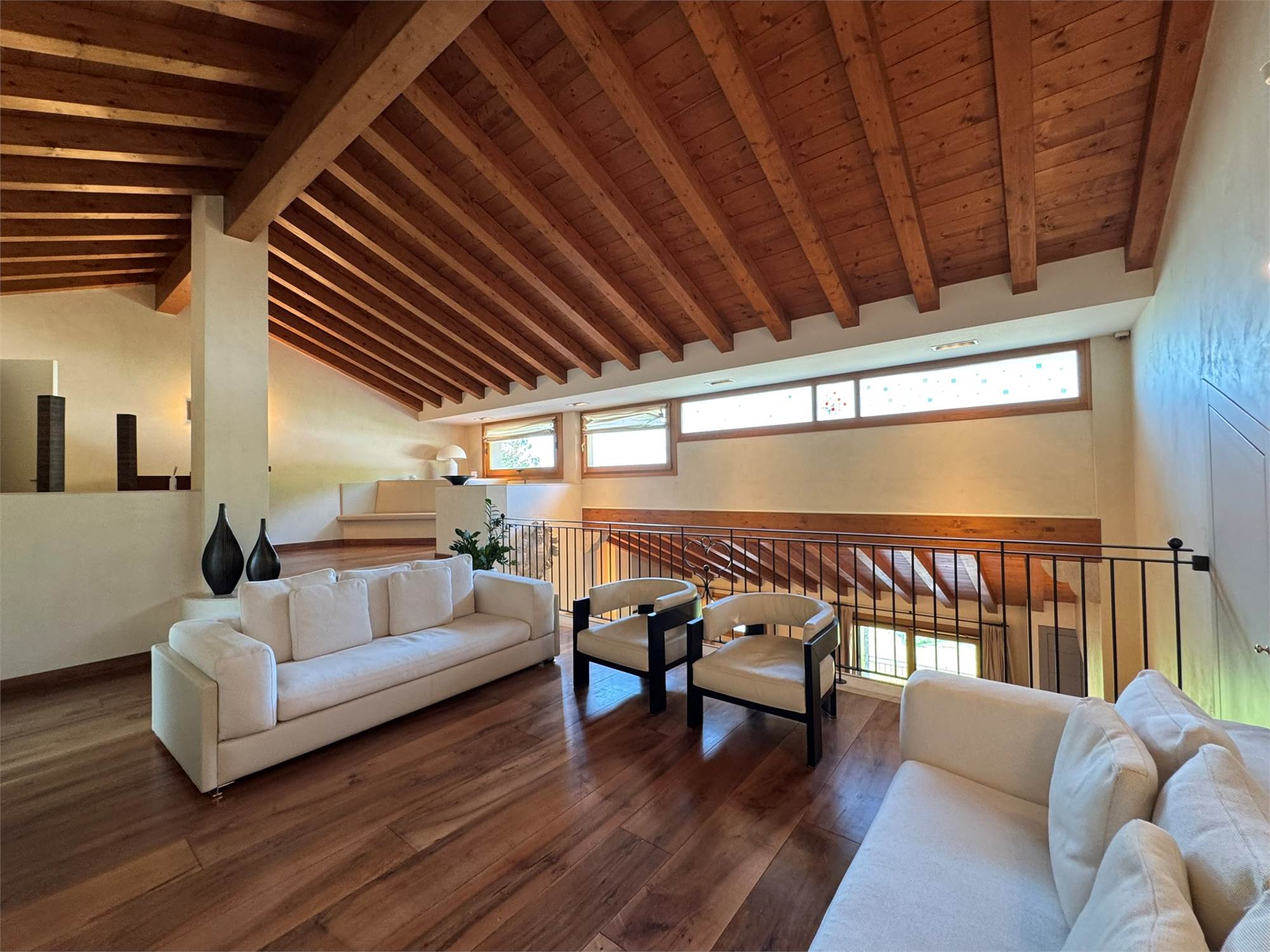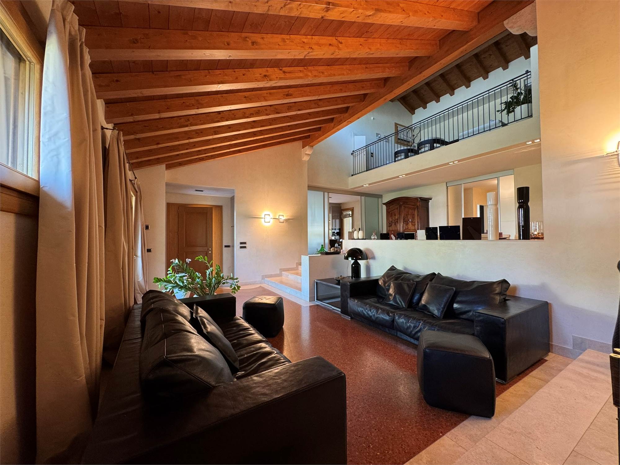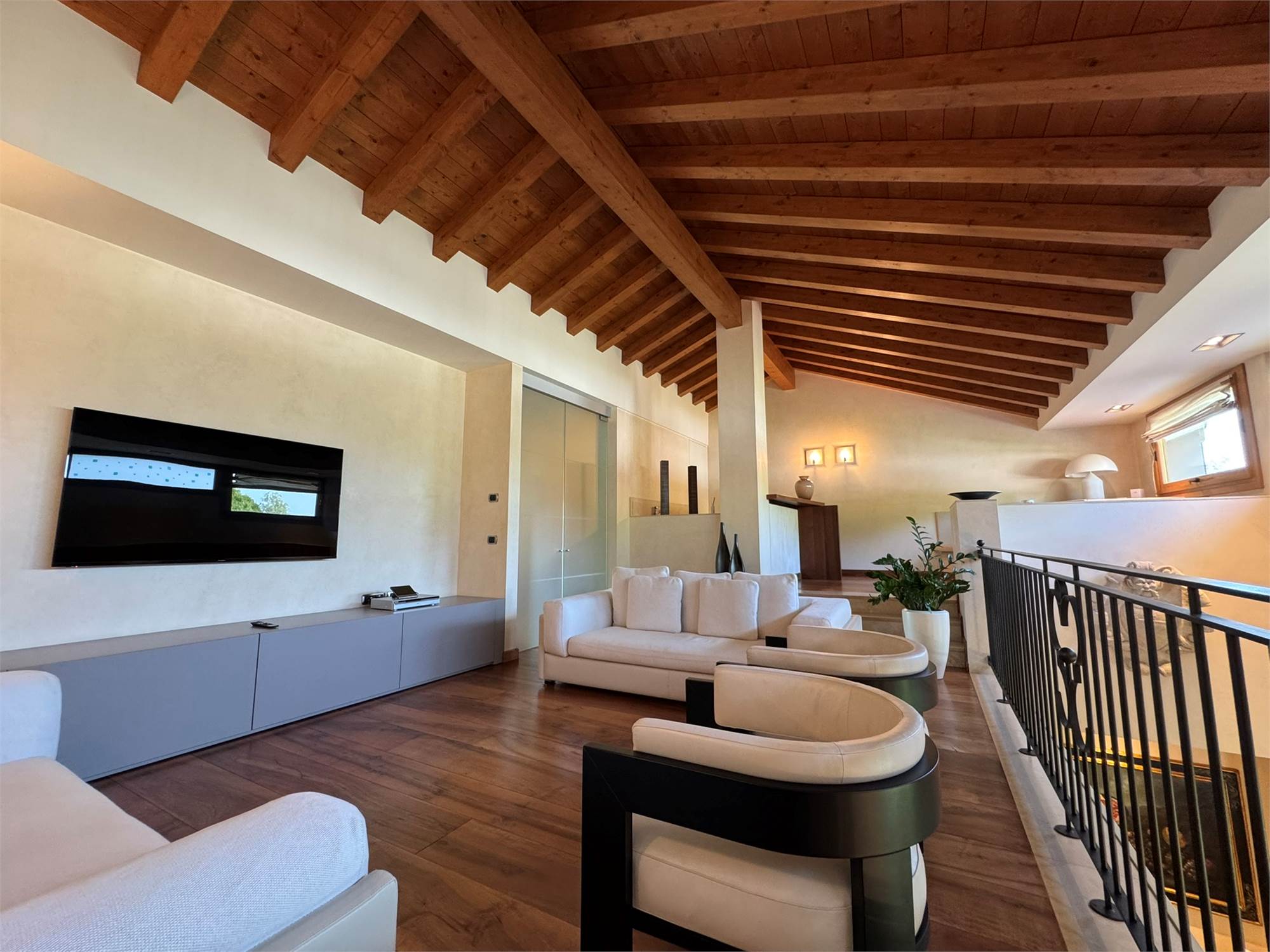 La villa è un esempio di architettura residenziale di alta gamma, con spazi ampi e luminosi, travi a vista, volumi armoniosi e un perfetto equilibrio tra materiali tradizionali e tecnologie moderne.