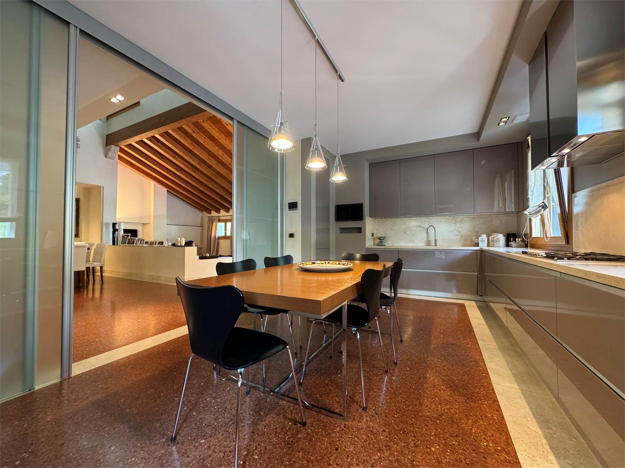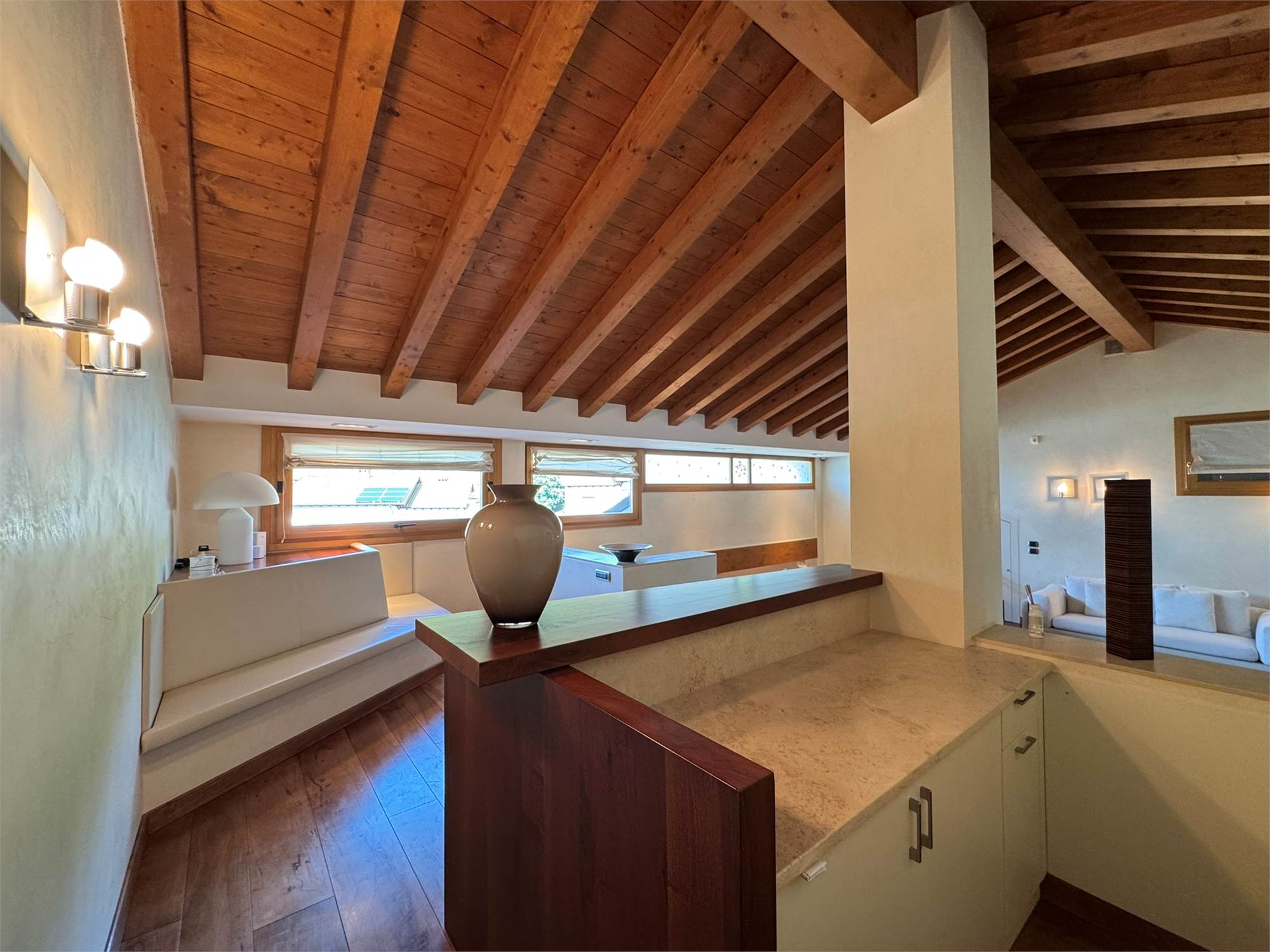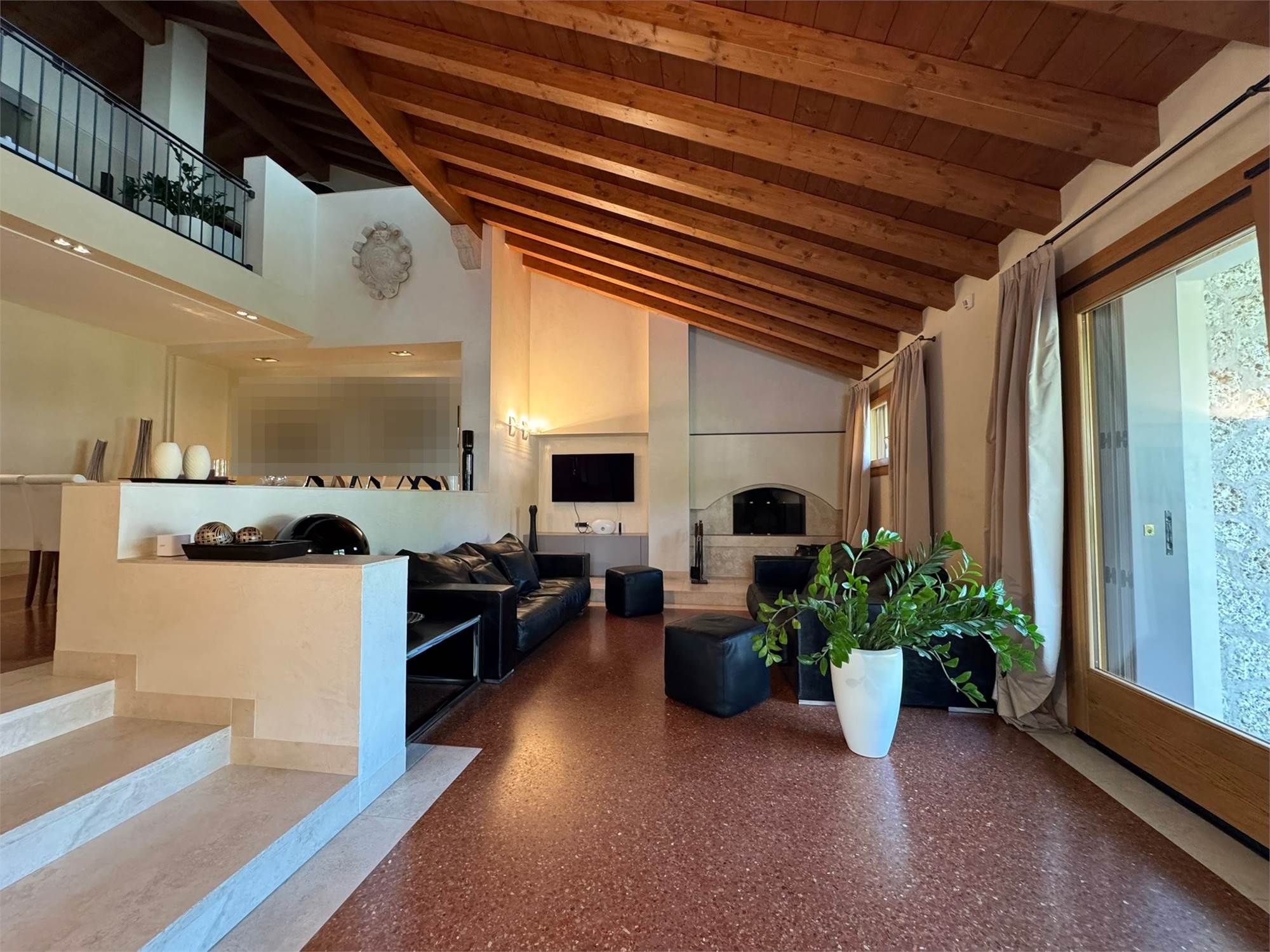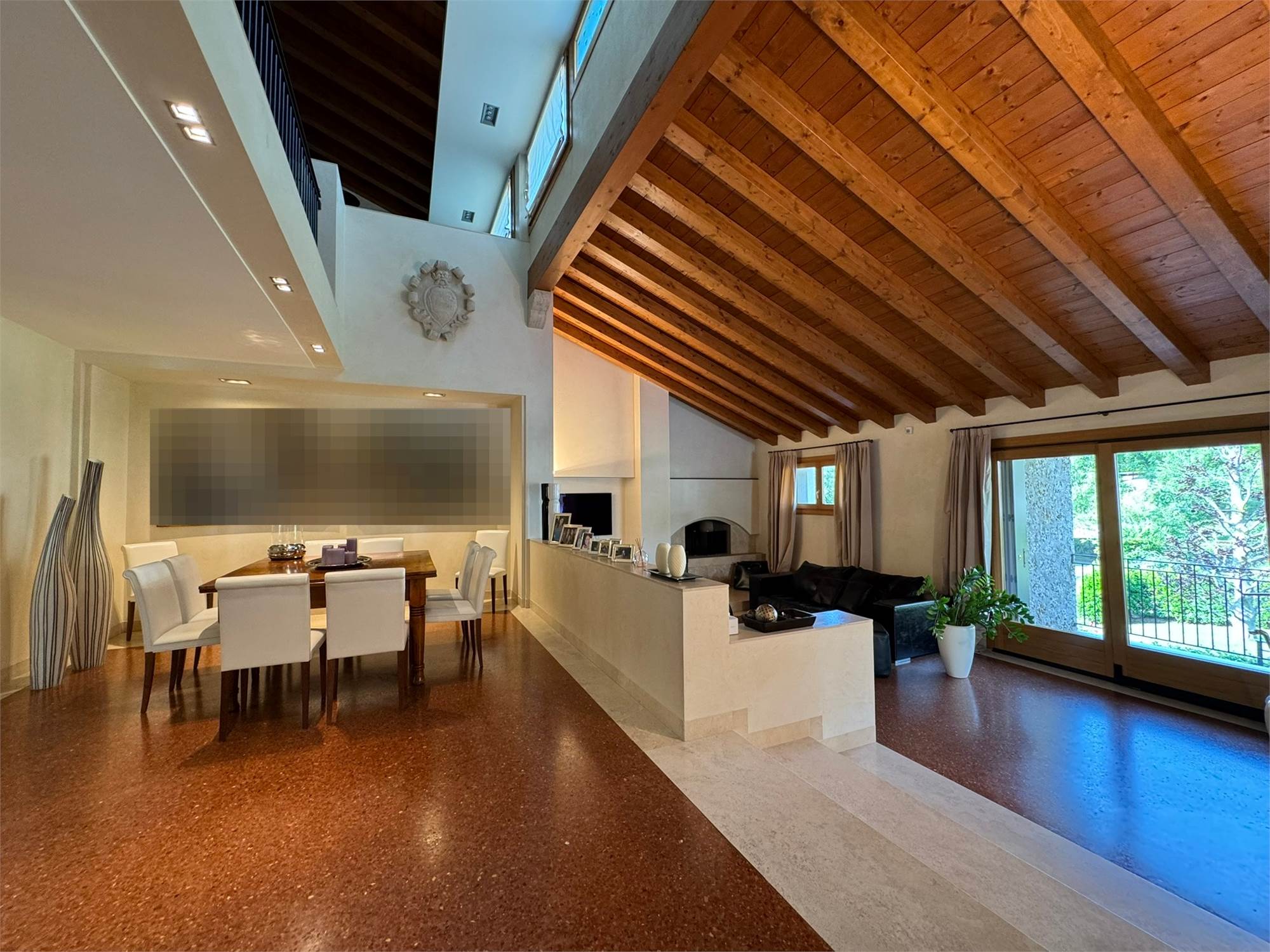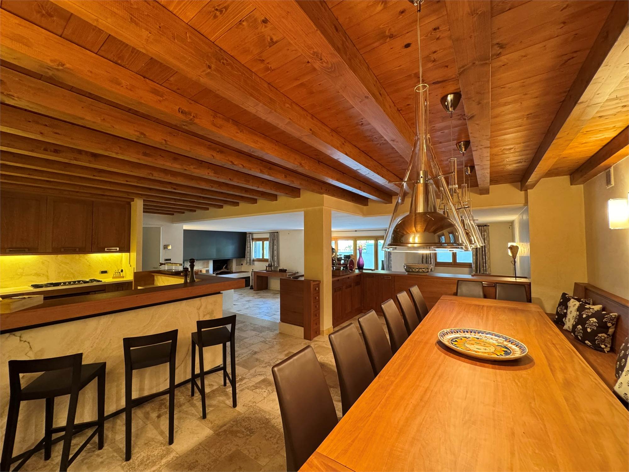 La villa è un esempio di architettura residenziale di alta gamma, con spazi ampi e luminosi, travi a vista, volumi armoniosi e un perfetto equilibrio tra materiali tradizionali e tecnologie moderne.
