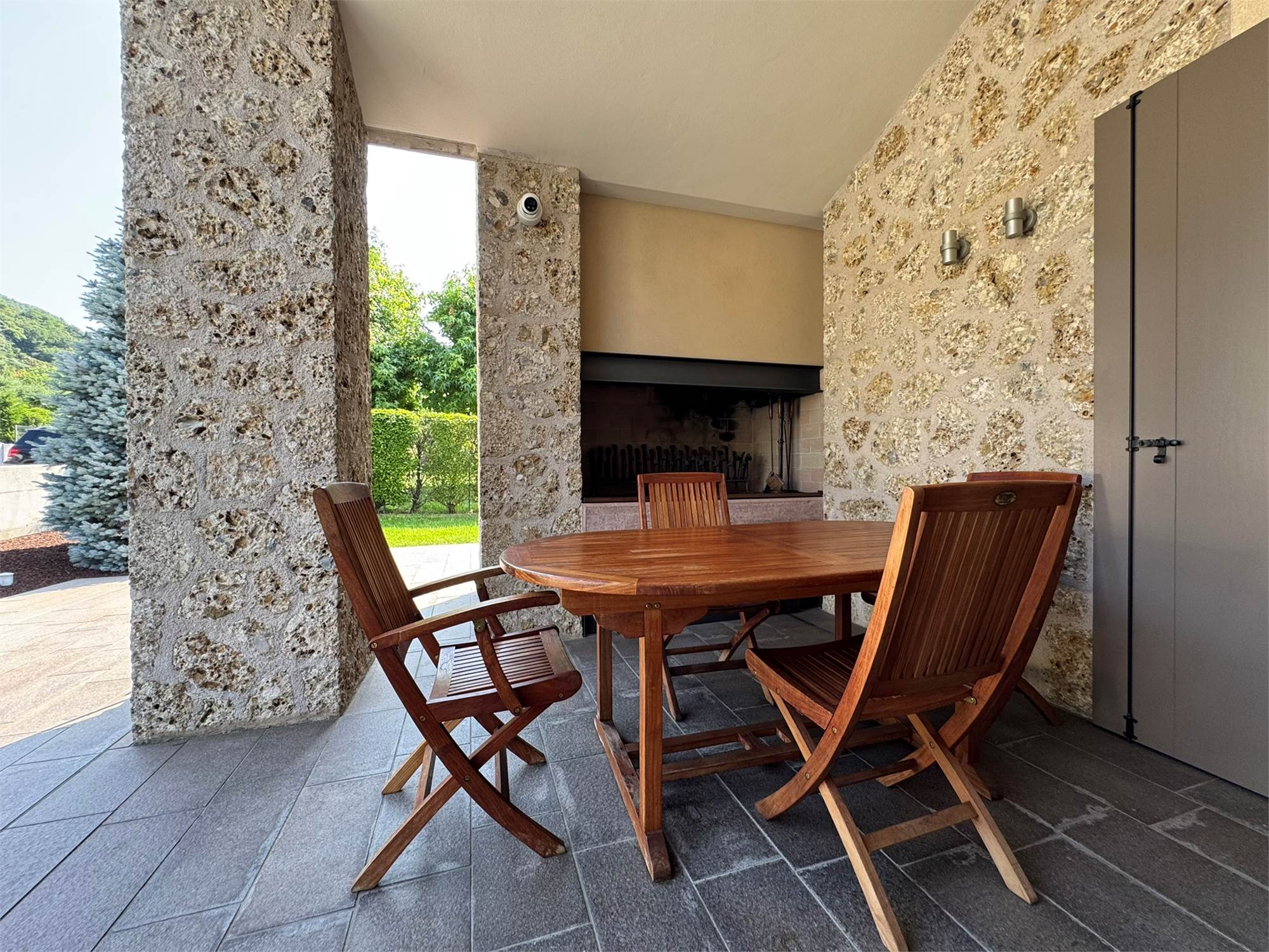 Cucina artigianale con accesso diretto al portico esterno con camino