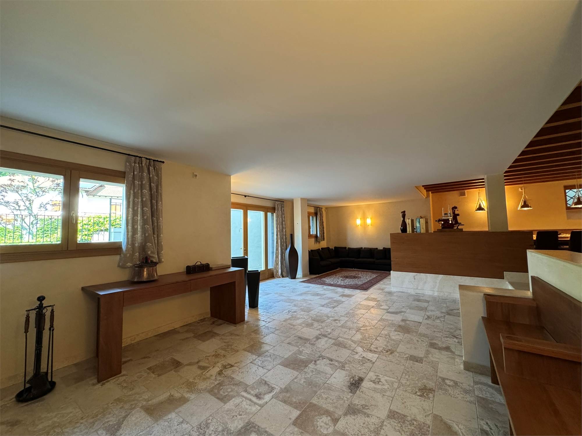Pavimentazione in coccio pesto bordato in travertino nella zona giorno