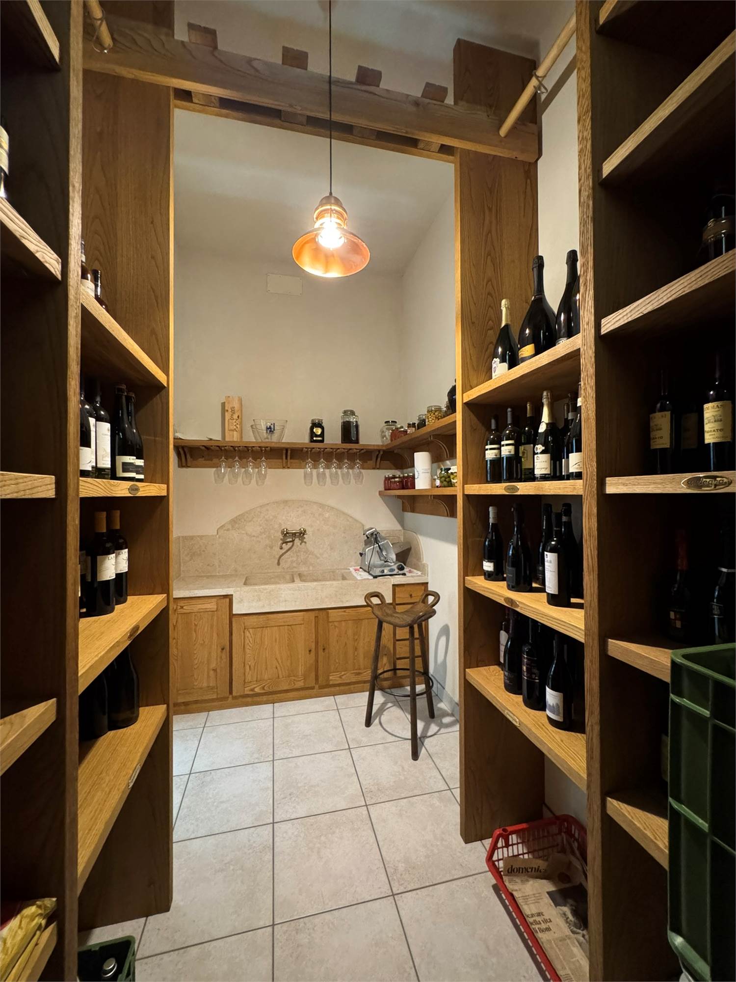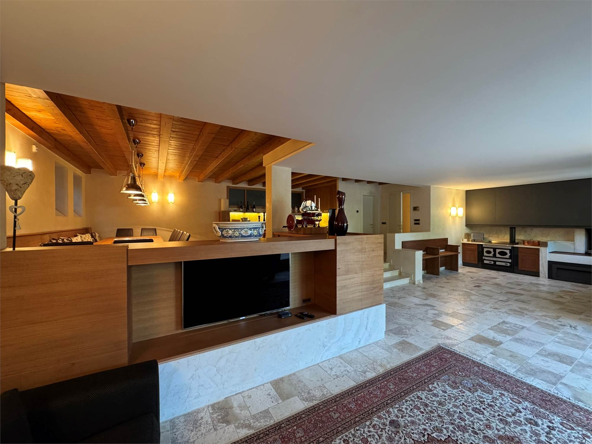 Ampia taverna con camino, cucina completa e arredi su misura